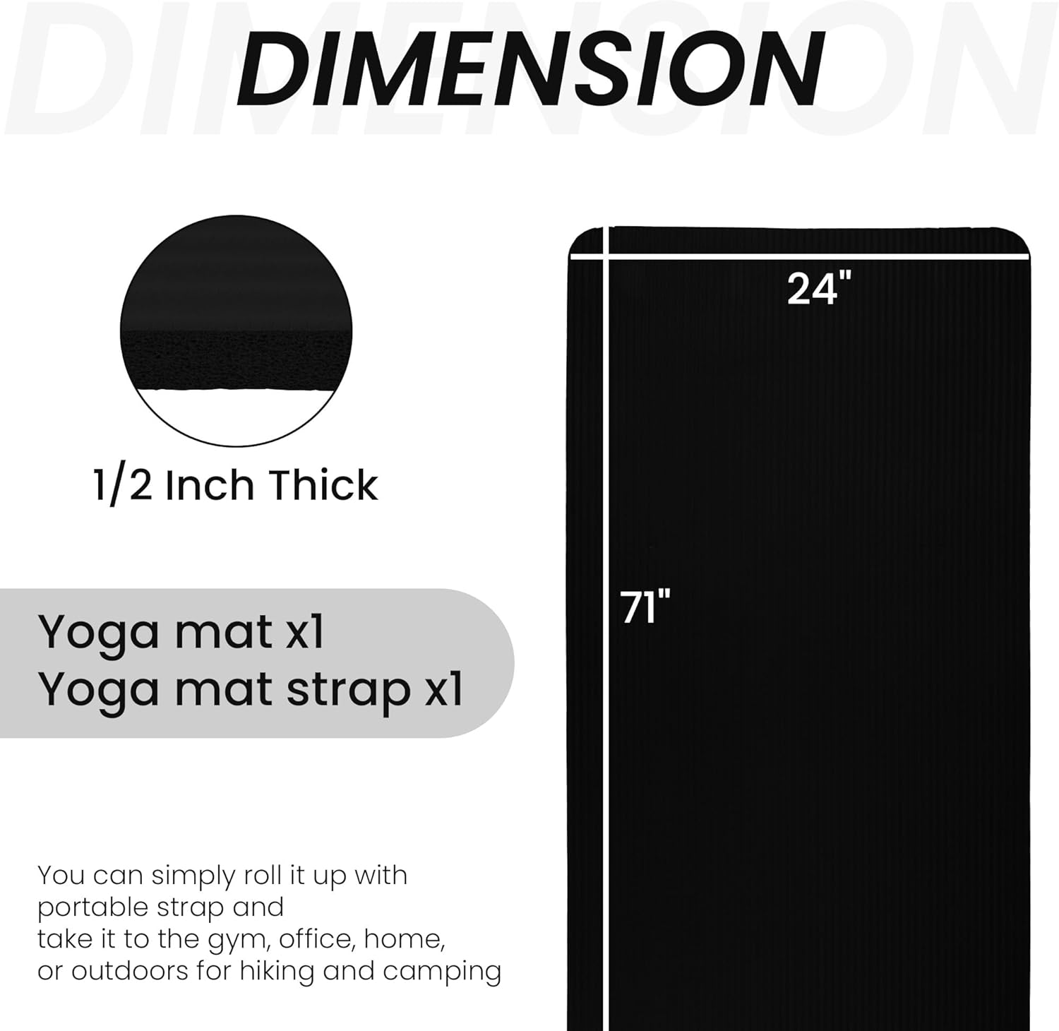 - 【Comfortable&Relaxed】Yoga mats are 71 inches long and 24 inches wide, ensuring comfort for people of all body types and sizes. High density foam material and 1/2-inch thick high-quality mat are used to cushion the spine, hips, knees and elbows on the hard floor comfortably